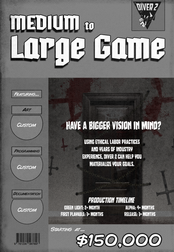 In addition to making our own titles, Diver 2 is also available to help you build your games! Our team has 25 years of combined work experience and can help you realize your vision through consulting, debugging, conceptualization, or one of our pre-established packages: